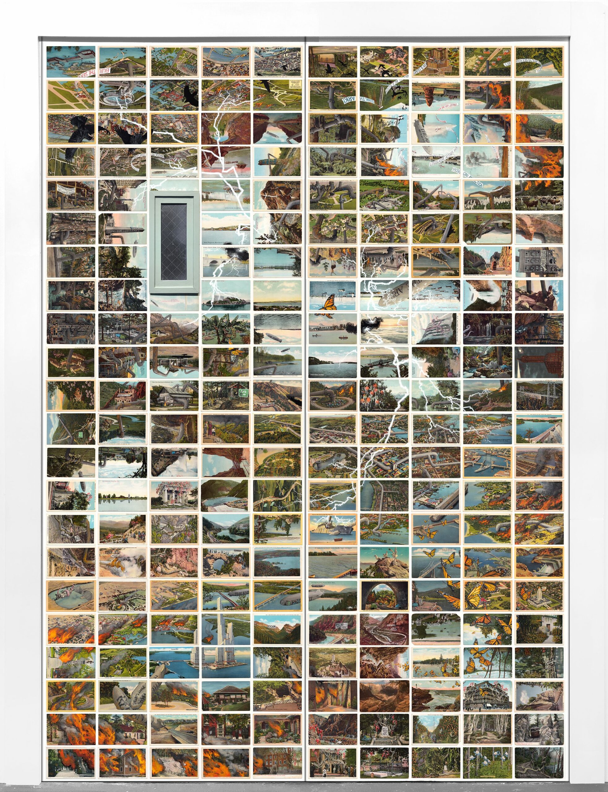 The antique postcards in this work pretend to show a more innocent, pre-crisis America. But Capitalism is baked into those old-timey pictures. We live — and have lived from the beginning — in an economic system that places profit above all other values. Externalities like the harmful effects of diesel pollution or the warming of the oceans don’t fit into anyone’s balance sheet so they don’t count.